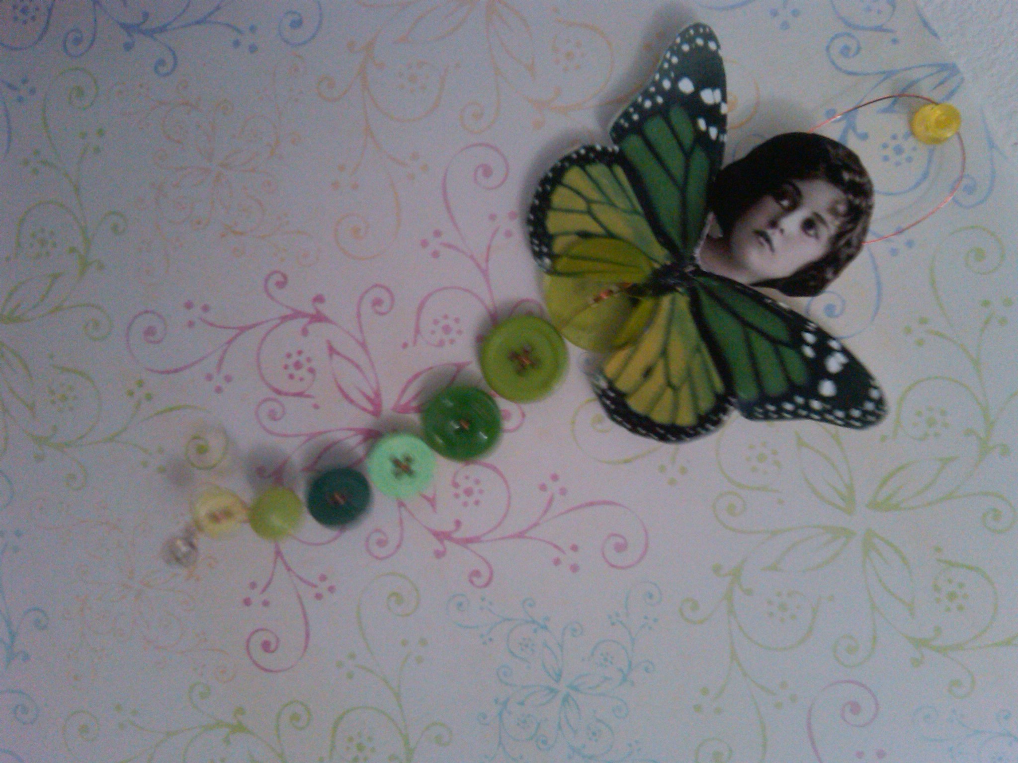 You will need a picture of a vintage face (or current if you choose), a butterfly of your choice printed on cardstock, about 5-8 buttons of different sizes (preferably large to small), a charm or jewel for the end, a random medium sized button, and thin wire. I used sticky back tape to assemble it.