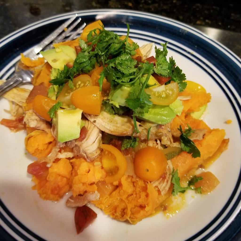 For lunch today I had crockpot chicken over a sweet potato. It was super tasty but I expected it to be spicier. I will for sure make it again and add more hot peppers for spice.