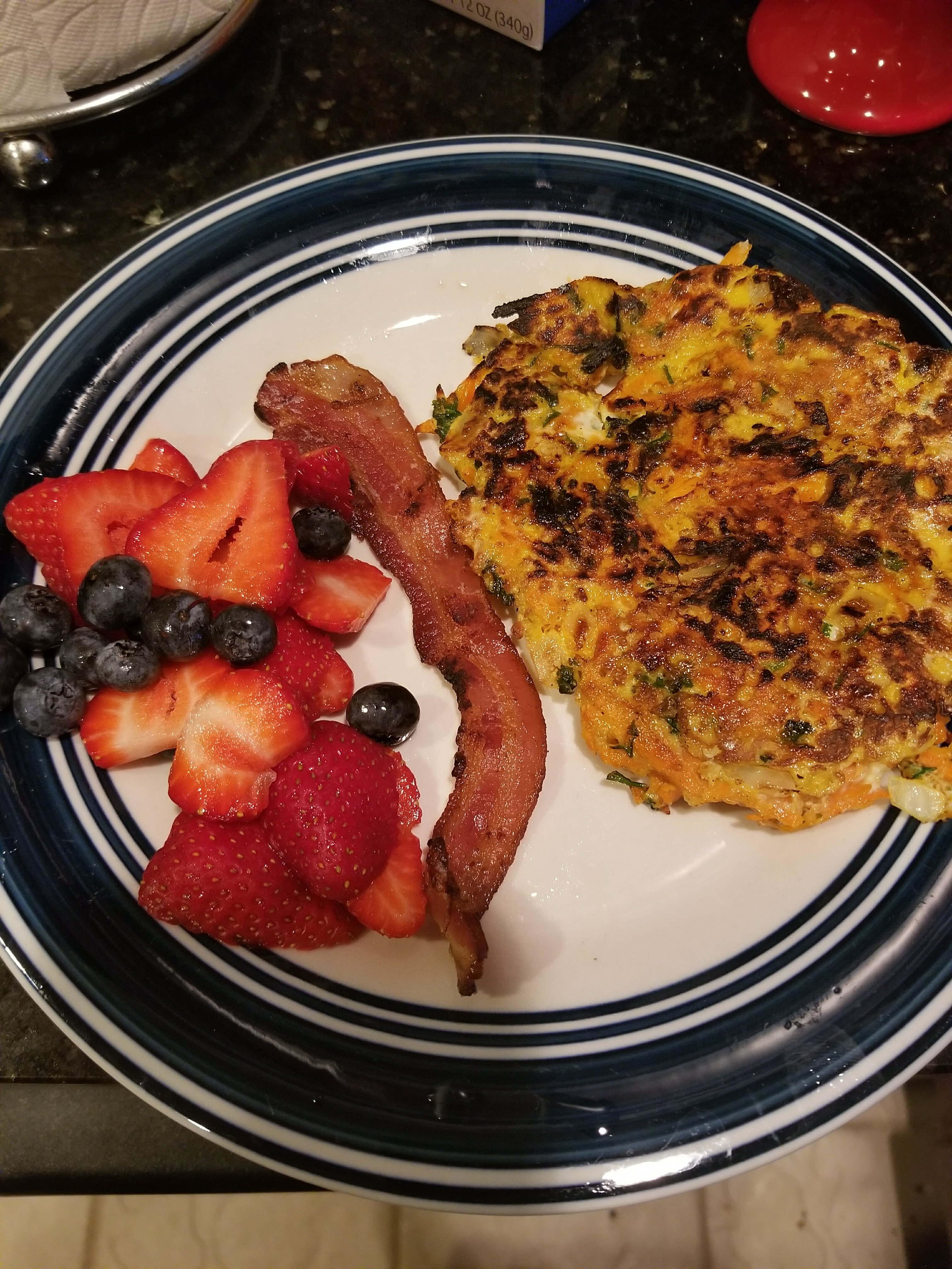 Oh yum! This was a good breakfast. A sweet potato latke. I am so glad Emese suggested this. I didn’t follow a recipe (Just directions) but it is a no recipe needed meal. I mixed together a total of 1 cup grated sweet potato, onions and cilantro with one well mixed egg and fried it until crispy with a small amount of olive oil. I did add a little salt and pepper to taste. Next time I will make it into two because one was too much.