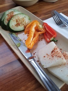 Instead of chips and salsa, I had sliced vegetables with guacamole and salsa.