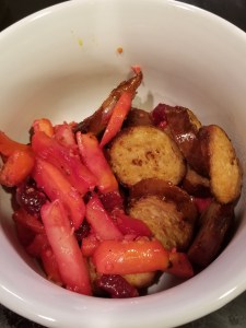 I went to MANY stores to find ground chorizo that was compliant. Before I did, I found chorizo sausages from Whole Foods. This dish was beets, sweet potatoes, carrots, and parsnips sautéed in a little olive oil with lots of garlic. It was a great balance of sweet and spicy.