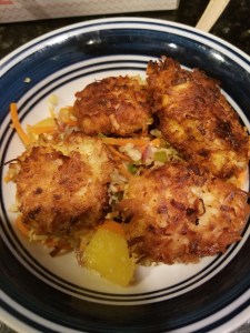 Tonight I retried to make coconut chicken. I chopped up one chicken breast, tossed it with coconut flour, chili powder, ground ginger, and sea salt, dipped it in a beaten egg, and rolled it in unsweetened coconut (a smaller grated coconut than I tried a couple weeks ago). Fried in a little olive oil until cooked… it really hit the spot. I put it on top of a cauliflower stir fry (cauliflower rice, red onions, green peppers, grated carrots, pineapple, garlic, coconut aminos, and sesame oil).