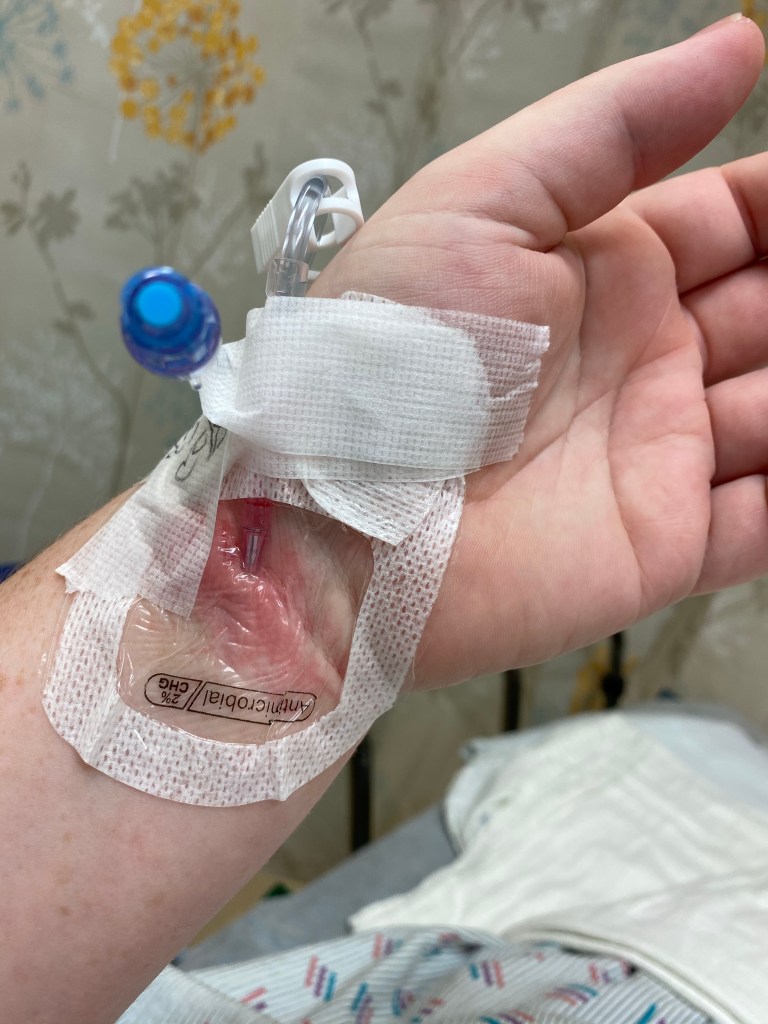 Something I have always known is that I have stubborn veins and arteries. It is not easy to get an IV placed. My sweet little check in nurse placed one on the first try but you can see the reaction in that location. The plan was to just start another IV after I was under anesthesia. Lots of people came and asked questions the two hours I was in prep. Same thing over and over again. The date, location, where I was, what I was doing and finally a nurse who shares my name said it was time. She asked about what I did for a living and where I worked. Talk about a small world when she told be her mother worked for Aegis Living at the home office. I knew her mother and it really immediately calmed me down as if I was with a weird family member. We finally made it to the OR and about 15 people were all moving and running around. We started talking about music and what I would like to fall asleep with. I commented no rap or heavy metal and ended up with the song I listen to make me happy. It is called “Music, Music, Music” by Teresa Brewer. It is an oldie but just lifts my spirit. I heard maybe 15 seconds of the song and then remember waking up to someone telling me I did great and it was time for a CT Scan. I was incredibly loopy but I remember being disappointed I didn’t get to hear my song. After the CT scan I was taken to my room and the nurse told me she just got done talking to my mom.